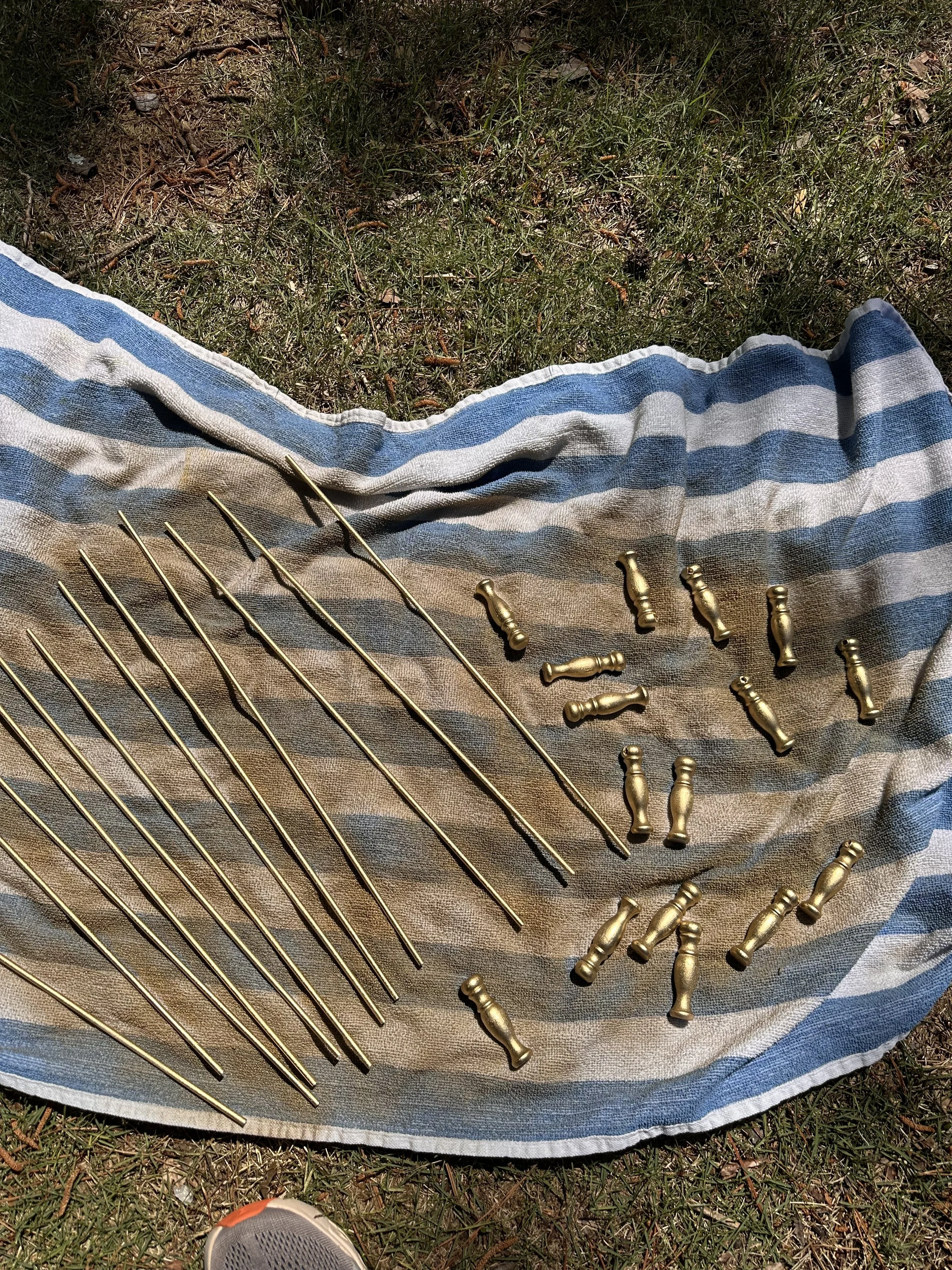 Next, I took everything outside and gave it a coat of gold spray paint. I used Rustoleum’s metallic gold spray, which gives a beautiful, convincing finish that looks like real metal without the cost.