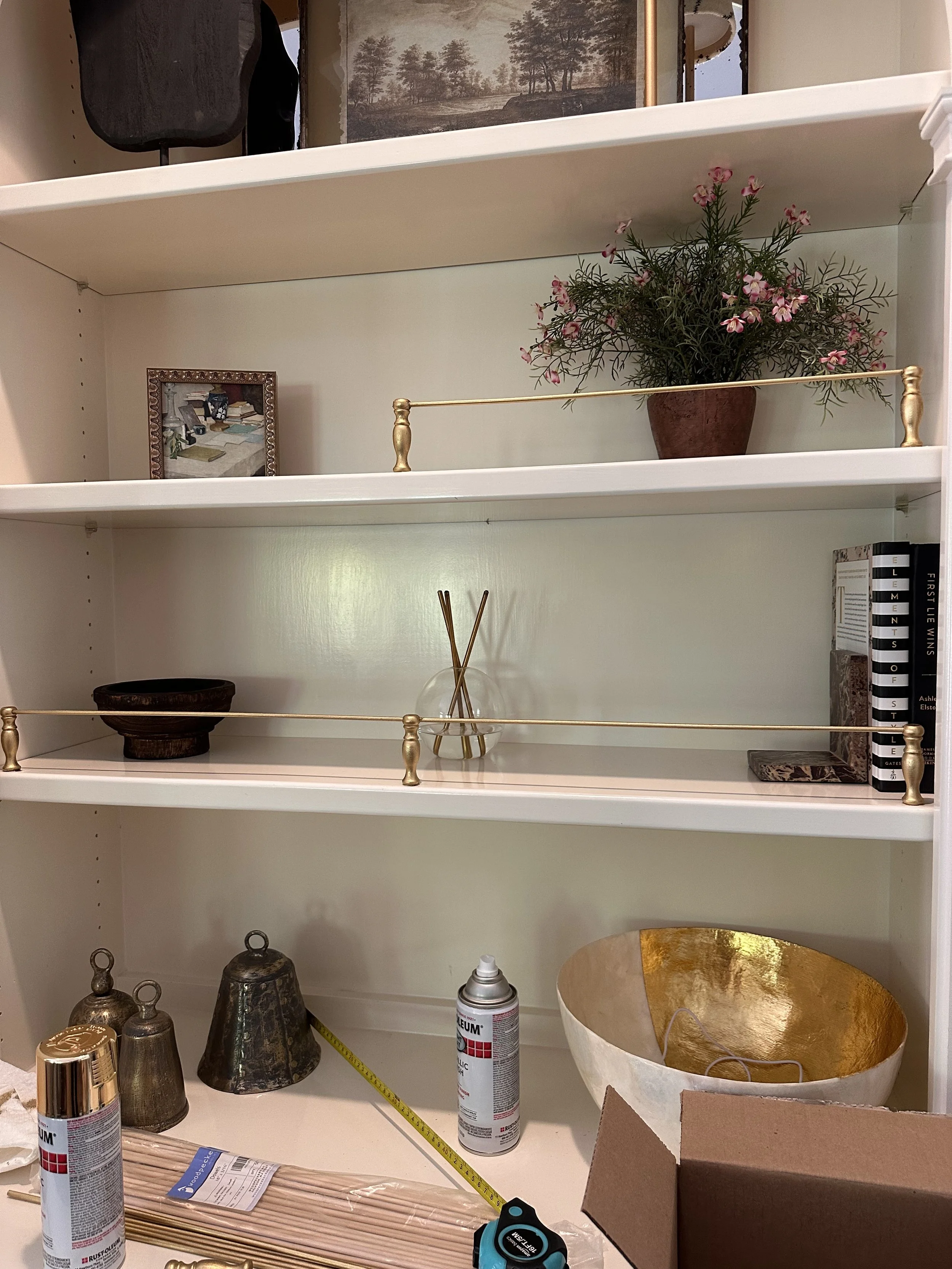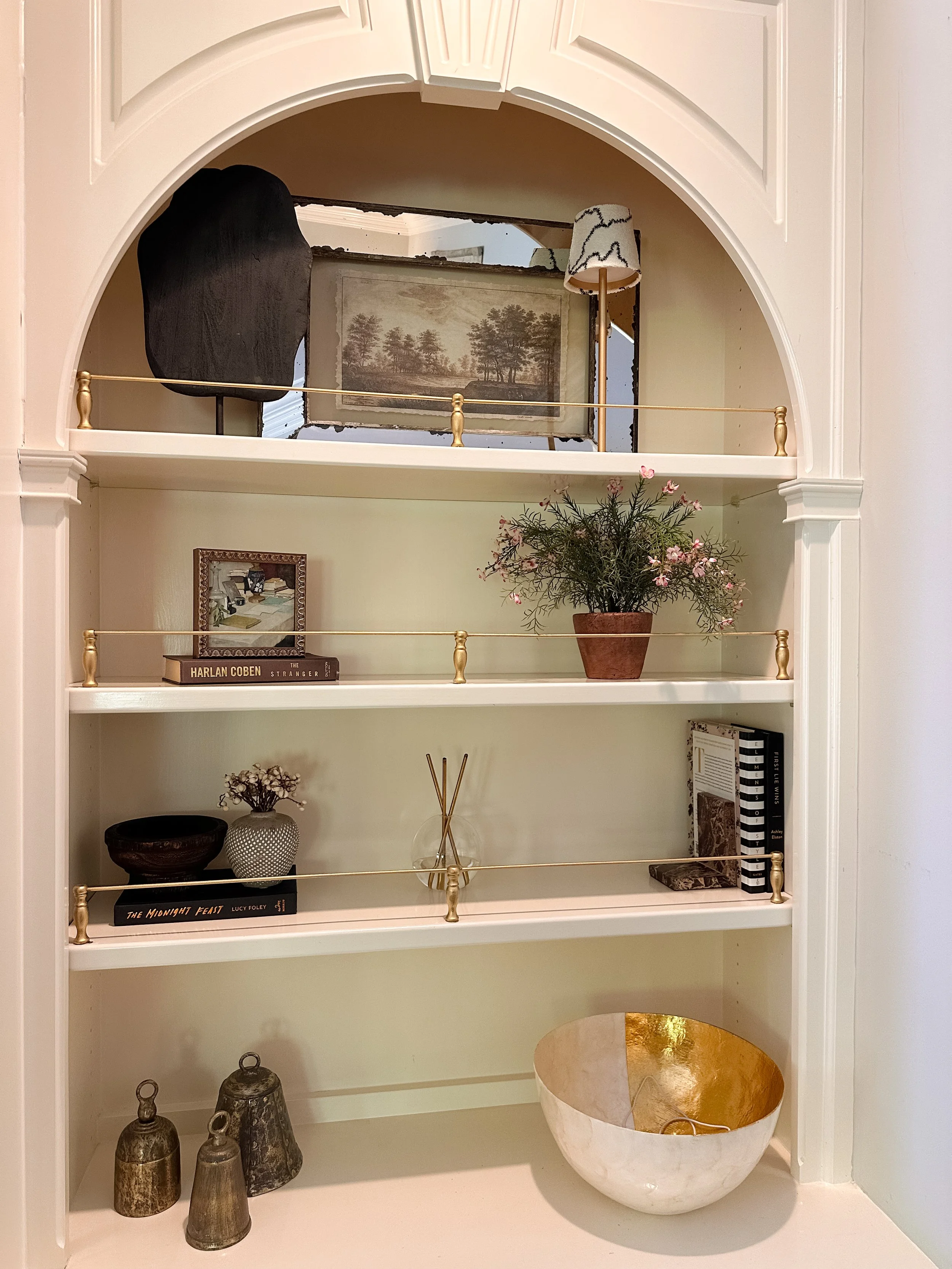 The gold gallery rails completely transformed the built-in, adding a layer of polish, charm, and custom character that you would never guess was a DIY project.