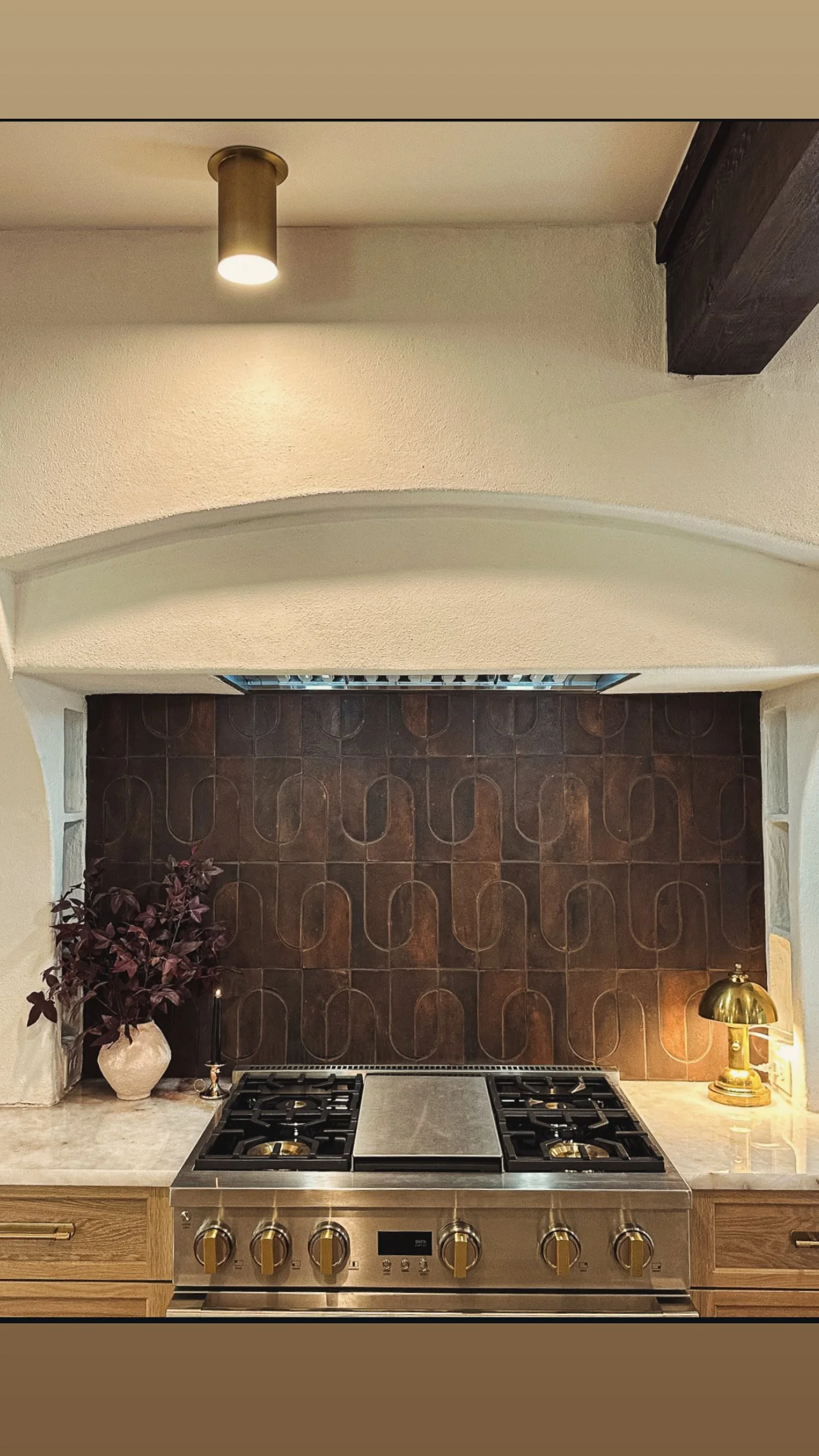 Here, the sculptural tile backsplash adds depth without demanding attention. Its matte finish absorbs light beautifully, balancing the soft plaster hood above and the golden wood tones below.